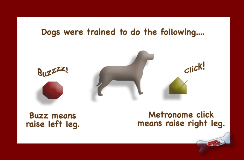 The dogs had not picked up on the type of sound. They honed in on the location of the cue, not the sound quality. The full extent of the experiment was a bit more complex. The conclusion the researchers came to was this: Responses differentiated by location are most likely to come under control of the spatial features. (Dobrzecka, Szwejkowska, Konorski 1966)