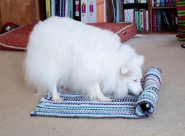 Encourage play with favorite toys as she is ready. I use longer plush toys, so there is room for my hand at one end, and still plenty of room at the other end for the dog to grab the toy without grabbing my hand (because she can’t see it). Will she chase it if you toss it across the room like you used to? Perhaps. But it is more likely that you will need to learn a new way of playing with her. Move the toy back and forth near her, but touch her with it playfully as you pull it around on her level. Let it move over her paws so she can feel it moving and be tempted to grab at it. If she can hear, use your voice to excite her in the same ways you used to so she recognizes this is a game.