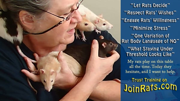 So you can imagine I was delighted to come across Gwen Lindsey’s work on rat body language and giving rats the chance to say yes or no to handling or other actions. She discusses the issues on this page, Let Rats Decide When, and has a lovely video on the same topic (embedded below). Gwen is the owner of the website JoinRats.com, a site that is chock full of advice for people who have rats as pets.