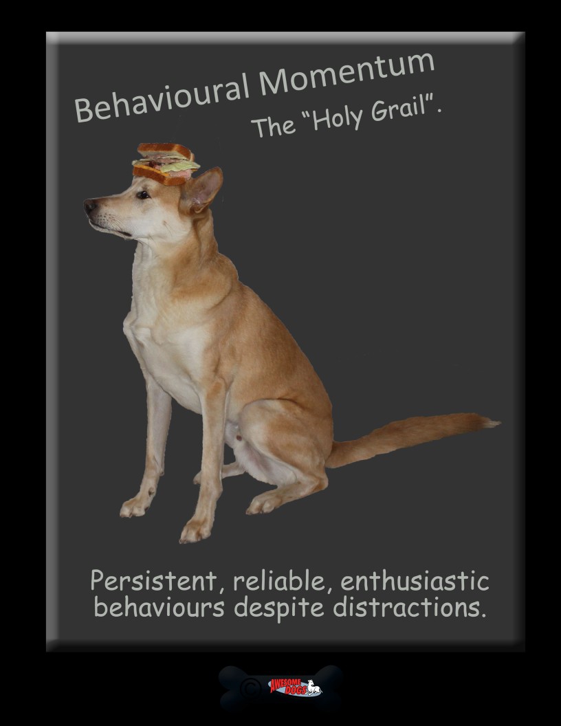 Domjan, in The Principles of Learning and Behavior describes behavioural momentum as, “response persistence in extinction.” In non-technical language, behaviours with momentum are enthusiastic, despite distractions. They are highly resistant to extinction. Behavioural momentum is the Holy Grail of dog training.