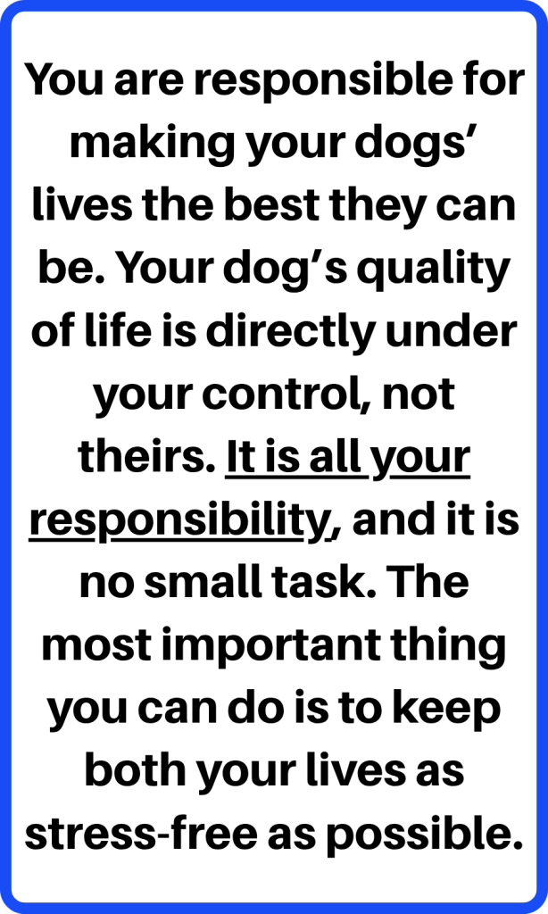 Your dog’s quality of life is directly under your control, not theirs. You are responsible for making your dogs’ lives the best they can be. It is all your responsibility, and it is no small task. The most important thing you can do is to keep both your lives as stress-free as possible.